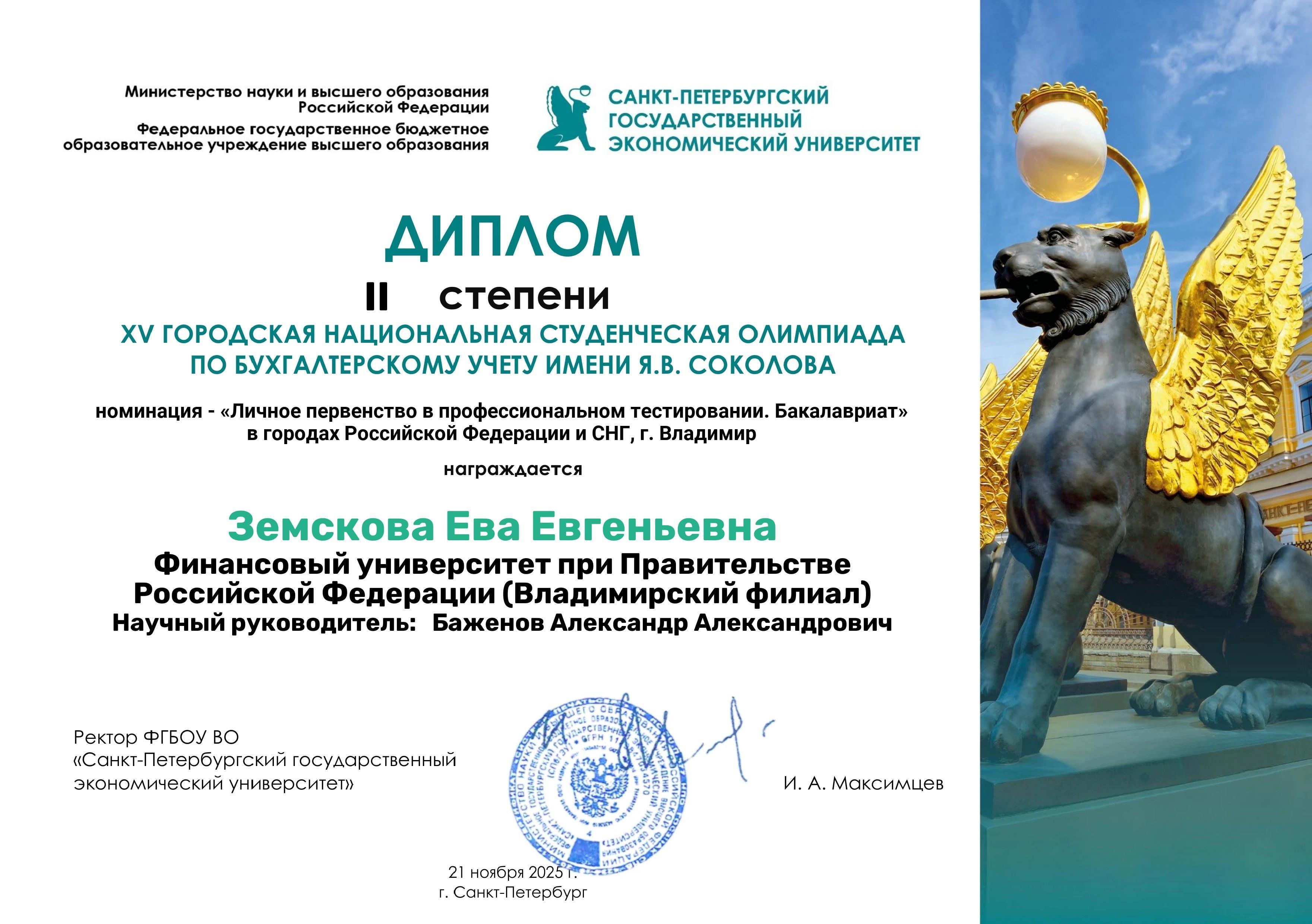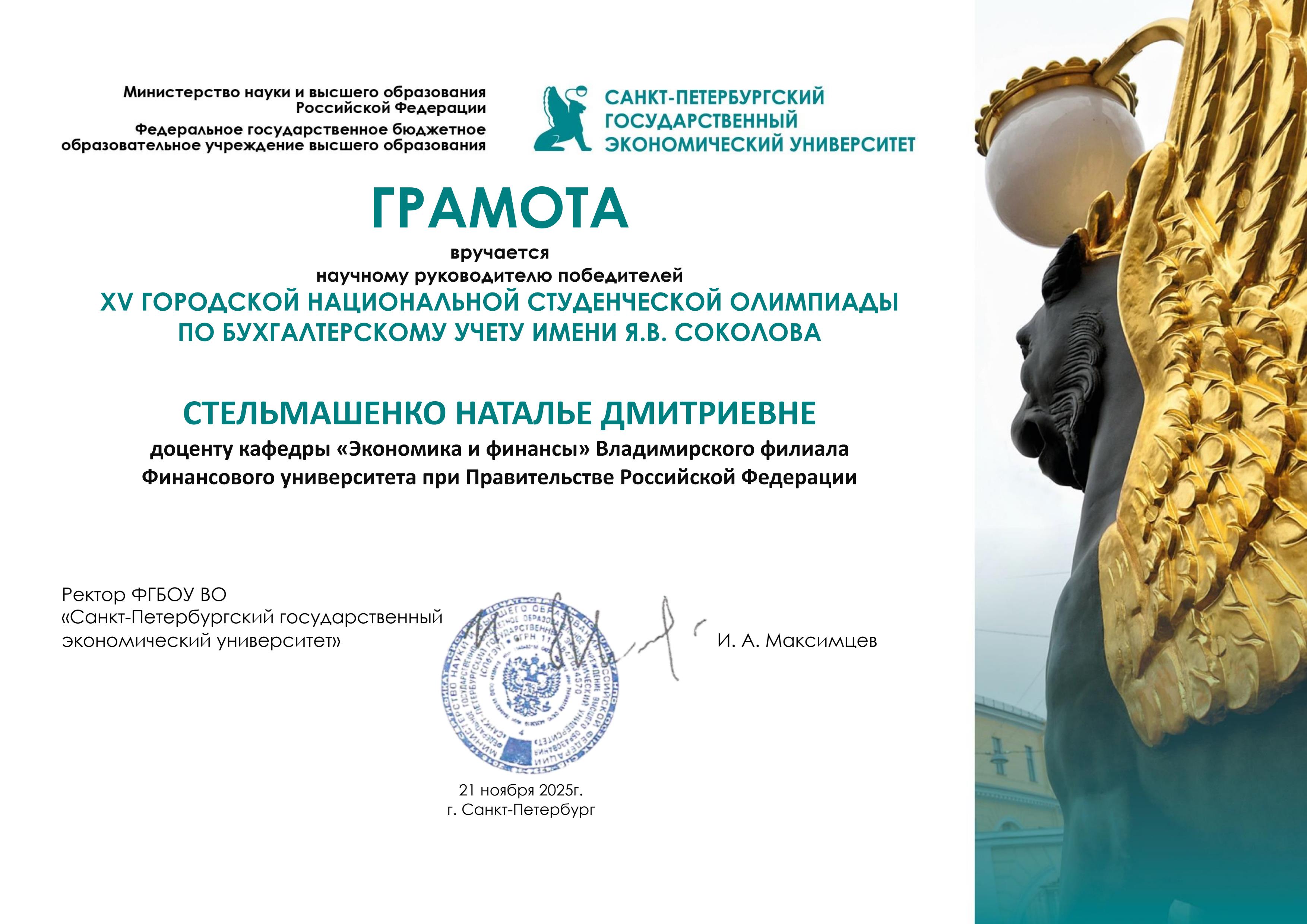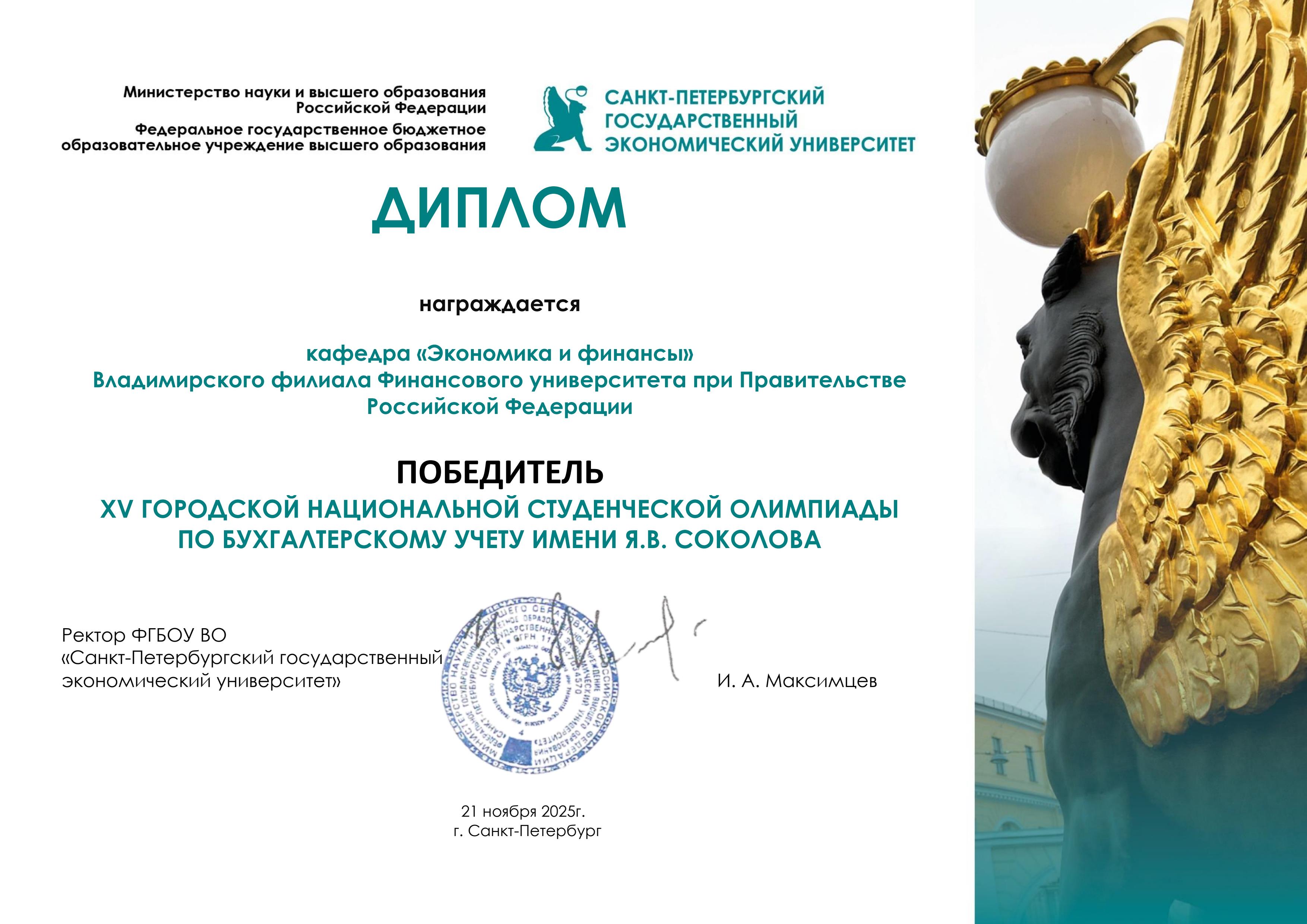 Победители и призеры отмечены Дипломами I, II и III степеней, а научные руководители – Грамотами. Кафедра "Экономики и финансов" во главе с заведующим Кузнецовым Д.В., к.э.н., доцентом награждена Дипломом как победитель XV городской национальной студенческой олимпиады по бухгалтерскому учету имени Я.В. Соколова.
