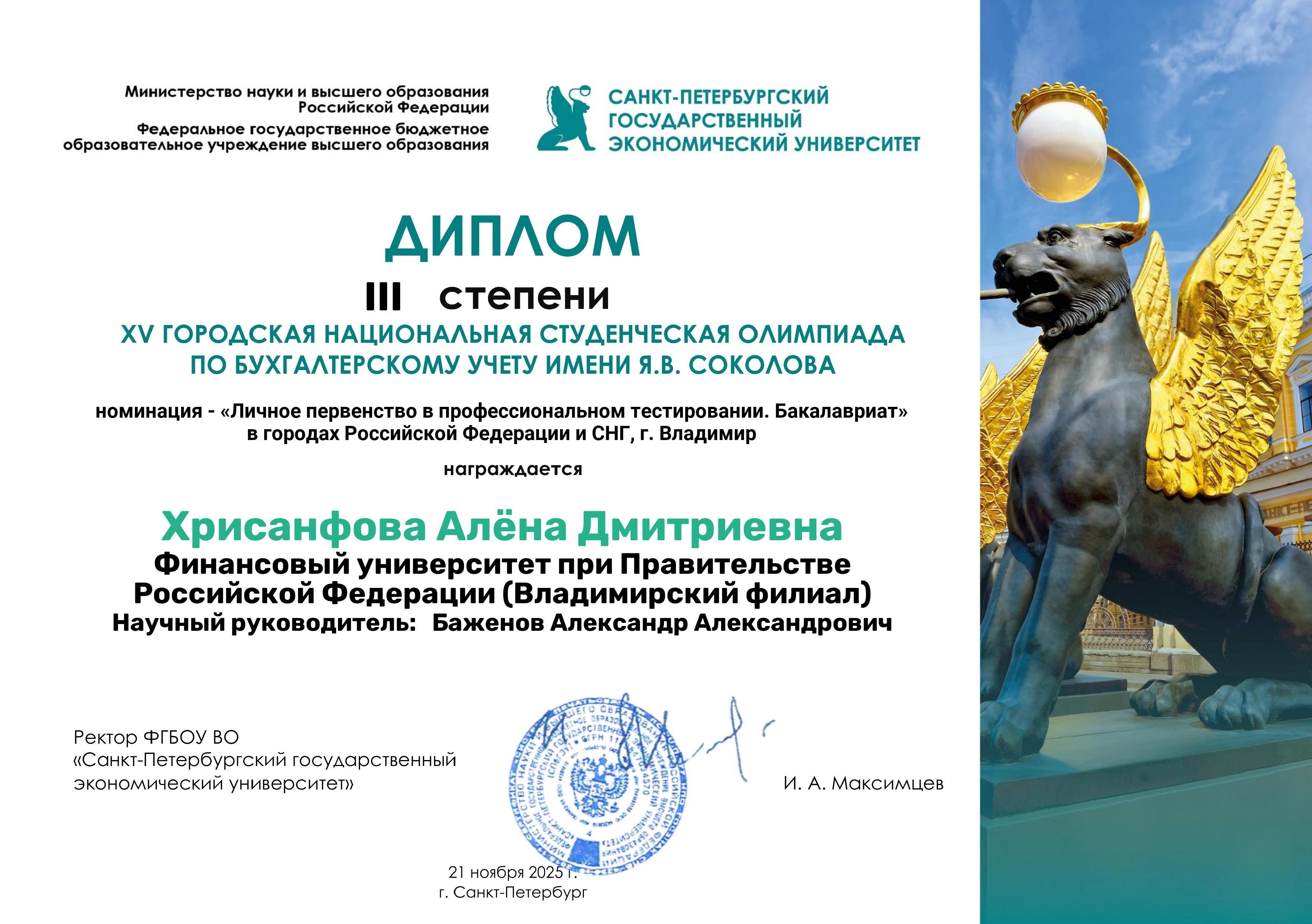 ✓ 3 место поделили Рязанцев Александр Сергеевич, Хрисанфова Алёна Дмитриевна (научный руководитель – Профессор Баженов А.А., к.э.н., доцент) и Афанасьева Нелли Максимовна (научный руководитель – Доцент Стельмашенко Н.Д., к.э.н., доцент).