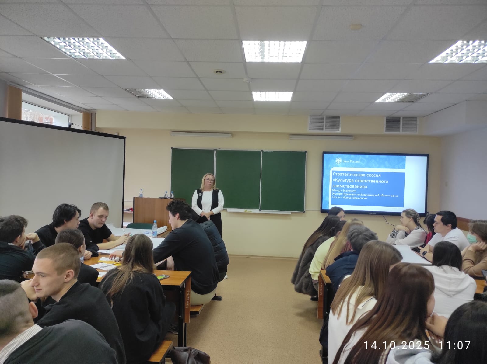 14 октября 2025 во Владимирском филиале Финуниверситета экспертом Отделения по Владимирской области Банка России были проведены два мероприятия: Стратегическая сессия «Культура ответственного заимствования» и интеллектуальная игра «Финансовый кругозор».